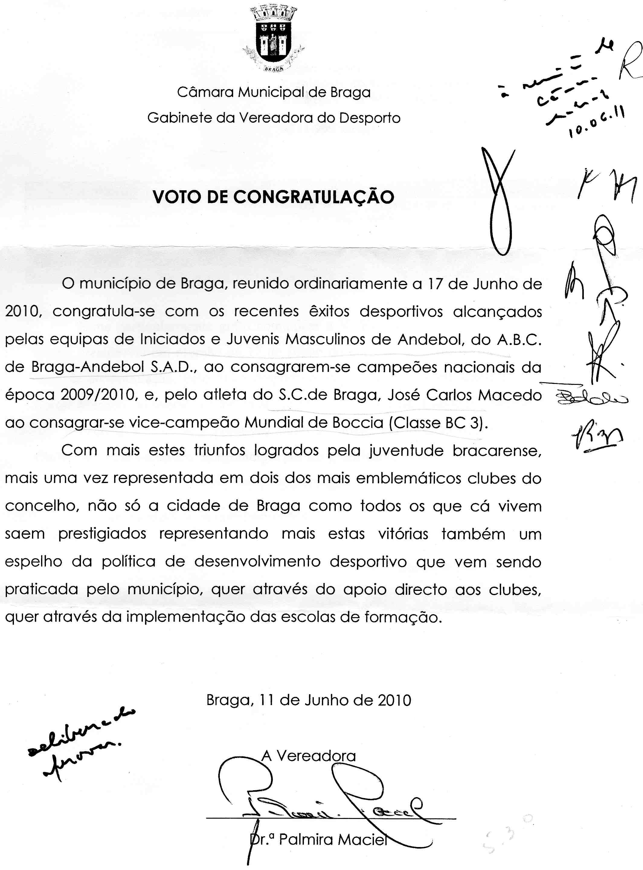 A Câmara Municipal de Braga deliberou aprovar um voto de congratulação pelo êxito desportivo alcançado pelo nosso atleta José Carlos Macedo, ao sagrar-se vice-campeão mundial de Boccia, em reunião de 17 de Junho de 2010.