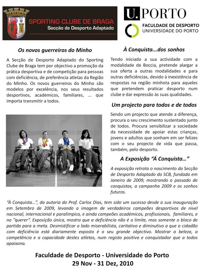 Exposição “À Conquista…” na Faculdade de Desporto da Universidade do Porto 02/01/2011 / Boccia Braga Classifique isto:Partilhar isto:Partilhar Clique para partilhar no Facebook (Abre numa nova janela) Facebook Carregue aqui para enviar por email a um amigo (Abre numa nova janela) E-mail Clique para partilhar no WhatsApp (Abre numa nova janela) WhatsApp Gosto Carregando... Relacionado