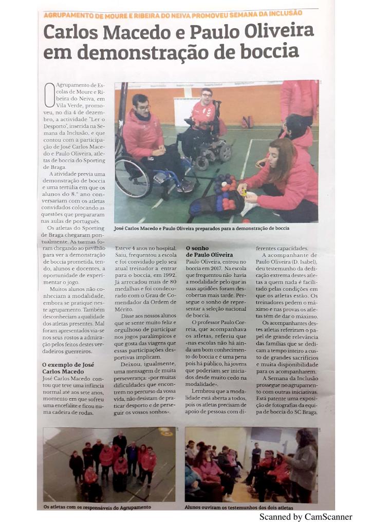 Na passada quarta-feira, dia 4 de Dezembro, a secção de Boccia do Sporting Clube de Braga fez-se representar nas cerimónias de comemoração da semana da inclusão do Agrupamento de Escolas de Moure e Ribeira de Neiva, em Vila Verde. O Sporting Clube de Braga, em parceria com o agrupamento, dinamizou três momentos distintos, sendo o primeiro dos mesmos a exposição “À Conquista…” que estará exposta até ao final do mês de Janeiro 2020, para todos os elementos da comunidade escolar.