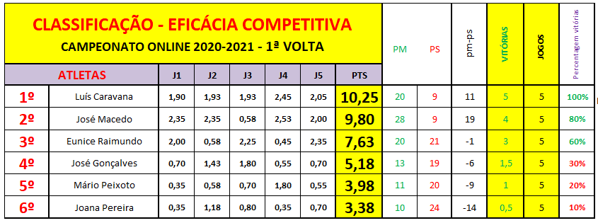 Surpresa, ou não, o Rookie Luís Caravana intrometeu-se entre os dois potenciais candidatos à vitória, tendo vencido a 1ª volta e foi apresentando jogos muito interessantes batendo os seus adversários quando menos o esperavam. Obtém, a segunda posição da prova por escassas duas décimas à frente do terceiro lugar, mas claramente à frente do grupo dos três últimos. Bom prenúncio do que pode alcançar nas provas presenciais, e a prova da evolução operada nas duas últimas épocas.