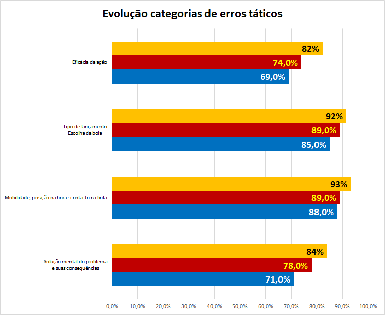 Nas quatro categorias de observação online (adaptadas de Friedrich Mahlo) a evolução média (de todos os atletas) é notória ao longo das três voltas, com realce para a “Solução Mental do problema e suas consequências” e para a “Eficácia da ação”, ambas com uma melhoria de 13%.