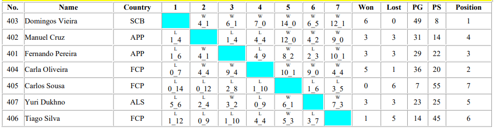 Jogando sempre de forma assertiva, com elevado recorte técnico e dominando taticamente todos os jogos como é sua caraterística, Domingos Vieira marcou 49 pontos e sofreu somente 8, nos 6 jogos realizados (média de 8 pontos marcados e 1 ponto sofrido por jogo) o que representa bem o ascendente perante todos os seus adversários, média muito distante dos seus adversários mais próximos na classificação final.