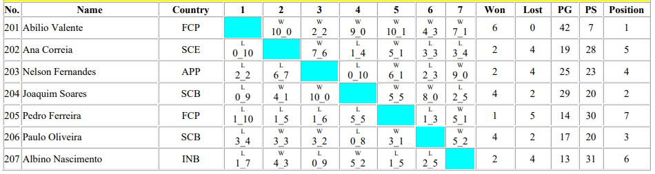 Jogando sempre de forma assertiva, com elevado recorte técnico e dominando taticamente todos os jogos como é sua caraterística, Domingos Vieira marcou 49 pontos e sofreu somente 8, nos 6 jogos realizados (média de 8 pontos marcados e 1 ponto sofrido por jogo) o que representa bem o ascendente perante todos os seus adversários, média muito distante dos seus adversários mais próximos na classificação final.