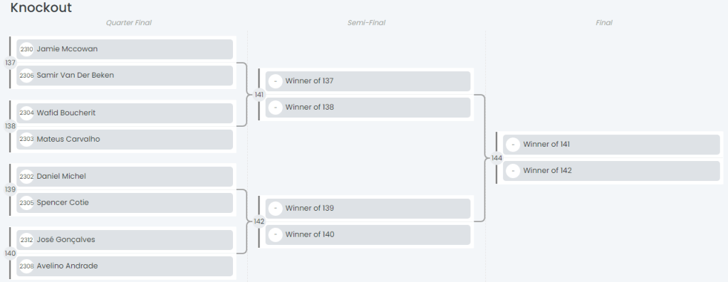 Nos 1/4 de final, José Abílio Gonçalves irá defrontar o seu companheiro da seleção, Avelino Andrade (18º ranking mundial), um adversário experiente e com muitos jogos internacionais.