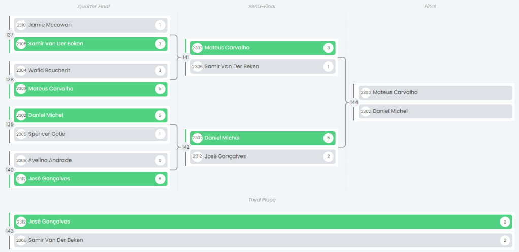 Acompanhado por Paulo Correia, José Abílio Gonçalves teve um jogo dificílimo perante o francês Samir Van Der Beken (nº 14 do ranking mundial), tendo terminado o jogo empatado a 2-2. No parcial de desempate, José Abílio Gonçalves levou a melhor sobre o seu adversário, apesar de o embate ter sido sempre muito aguerrido até à última bola.