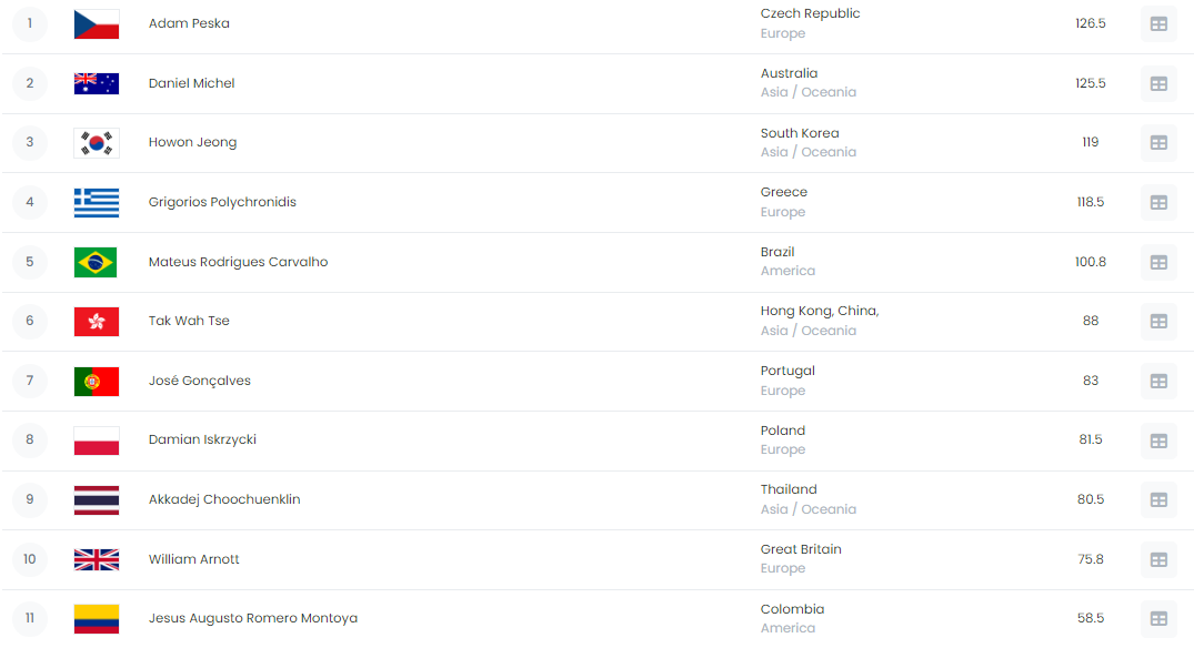 José Abílio Gonçalves é o atual 7º classificado do ranking mundial (3º do ranking europeu) entre 65 atletas com pontuação em provas internacionais, e pontuáveis para o apuramento para os JP, e Portugal é o 11º país entre 35 países.