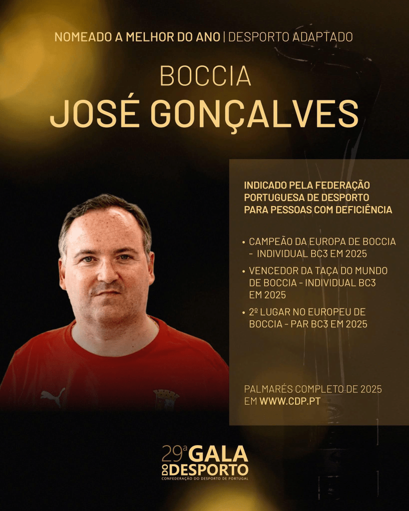 José Gonçalves nomeado para os “Melhores do Ano” da Confederação de Desporto de Portugal 27/04/2026 / Boccia Braga 𝐀𝐬 𝐯𝐨𝐭𝐚𝐜̧𝐨̃𝐞𝐬 𝐣𝐚́ 𝐞𝐬𝐭𝐚̃𝐨 𝐚𝐛𝐞𝐫𝐭𝐚𝐬 em: https://shre.ink/Lc7k A votação decorre até ao dia 13 de maio. Vota José Gonçalves. Classifique isto:Partilhar isto:Partilhar Partilhar no Facebook (Abre numa nova janela) Facebook Email a link to a friend (Abre numa nova janela) E-mail Share on WhatsApp (Abre numa nova janela) WhatsApp Gosto Carregando... Relacionado