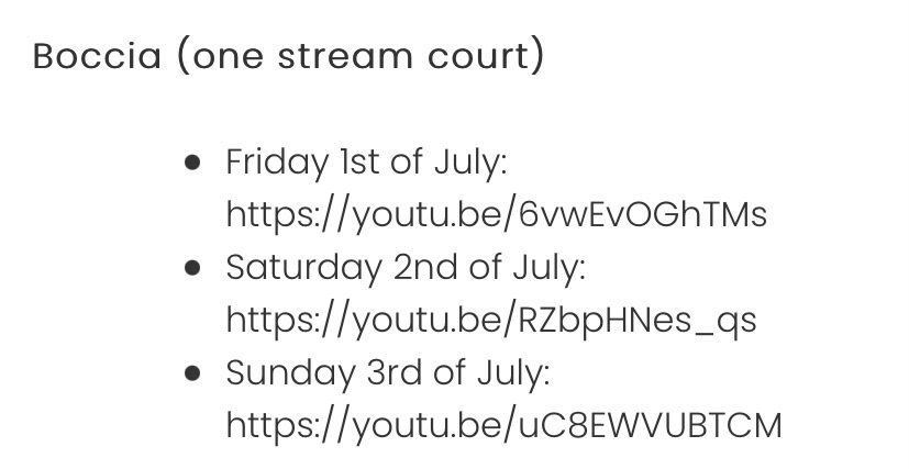 Os jogos de Boccia terão transmissão em direto, online, através dos links indicados a seguir: