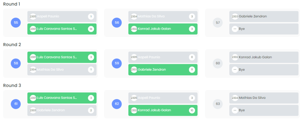 Já Luís Caravana levou de vencida todos os jogos realizados, apesar de ter encontrado adversários difíceis, nomeadamente o francês Mathias Da Silva, o italiano Gabriele Zendron e o norueguês Konrad Logan, contra os quais teve de se manter a bom nível para conseguir controlar os jogos e conseguir vencer.