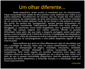 Por fim, o autor da exposição fotográfica, Marco Mendes, agradeceu a presença dos convidados e expôs a sua visão e sentimentos que nortearam a criação desta obra. Demonstrou o seu afeto pelos atletas, o reconhecimento por todo um trabalho de treino dedicado e exigente, feito de pormenores, que conheceu e percebeu, bem como o alcance que um trabalho desta natureza pode ter em termos sociais, linhas, aliás, que incorporou nos seus quadros e desenharam as áreas temáticas da exposição.